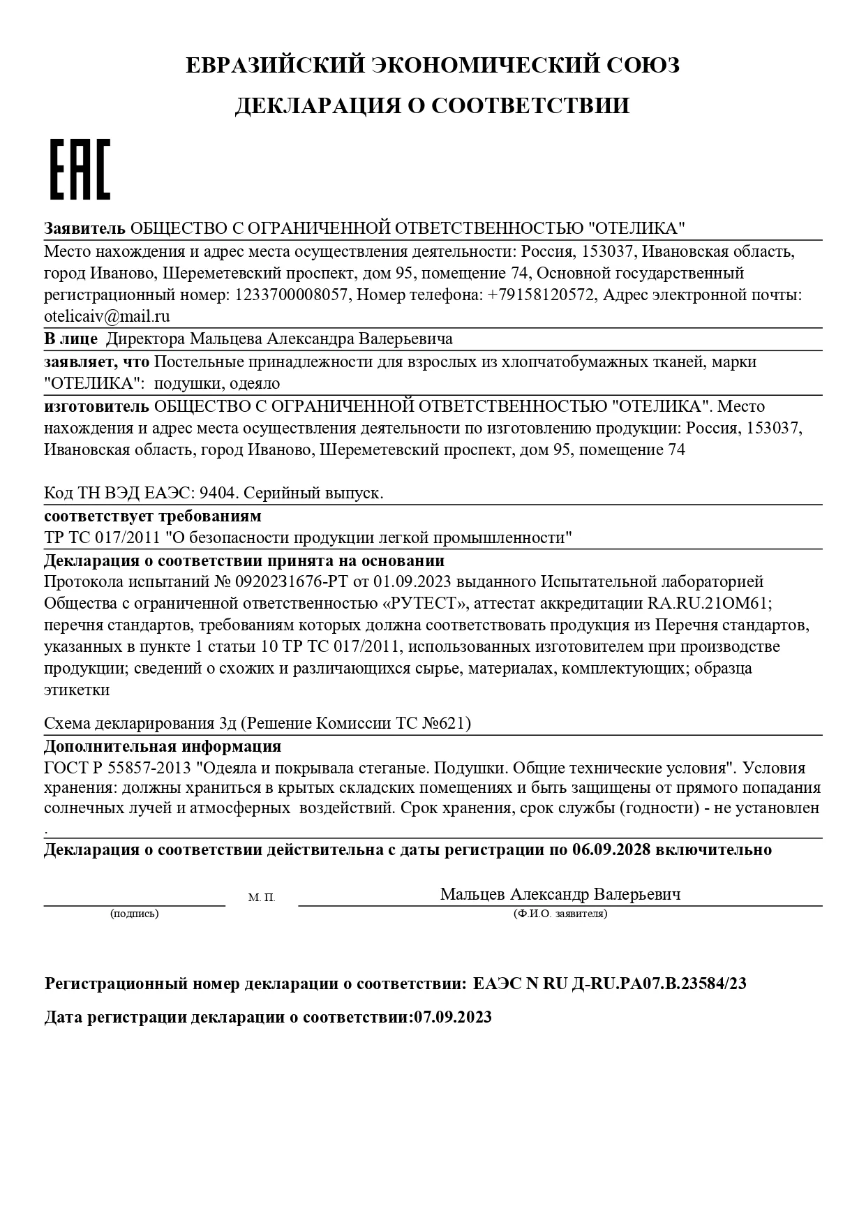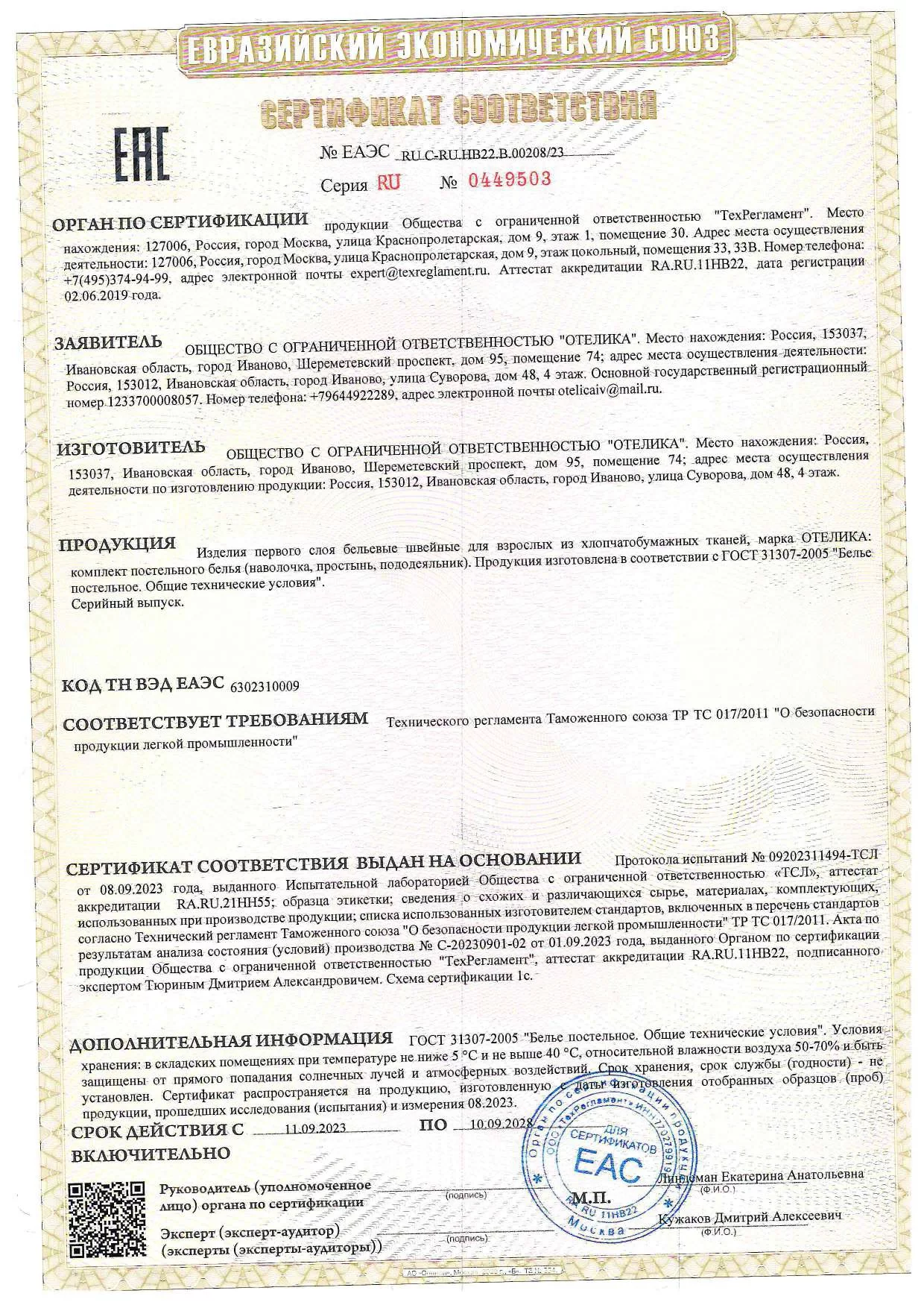 Вся выпускаемая нами продукция, прошла необходимую сертификацию и соответствует требованиям “О безопасности продукции легкой промышленности” ТР ТС 017/2011