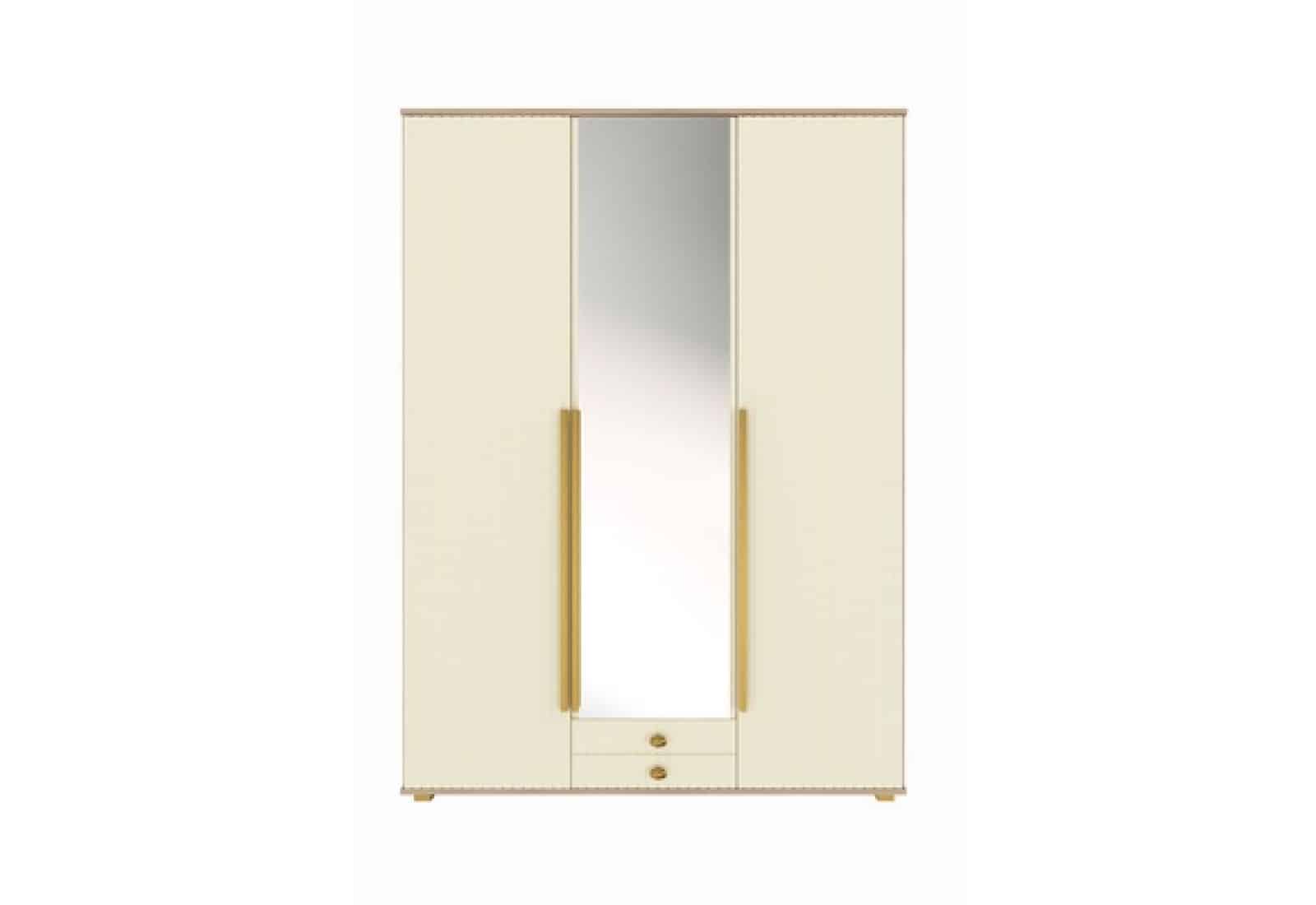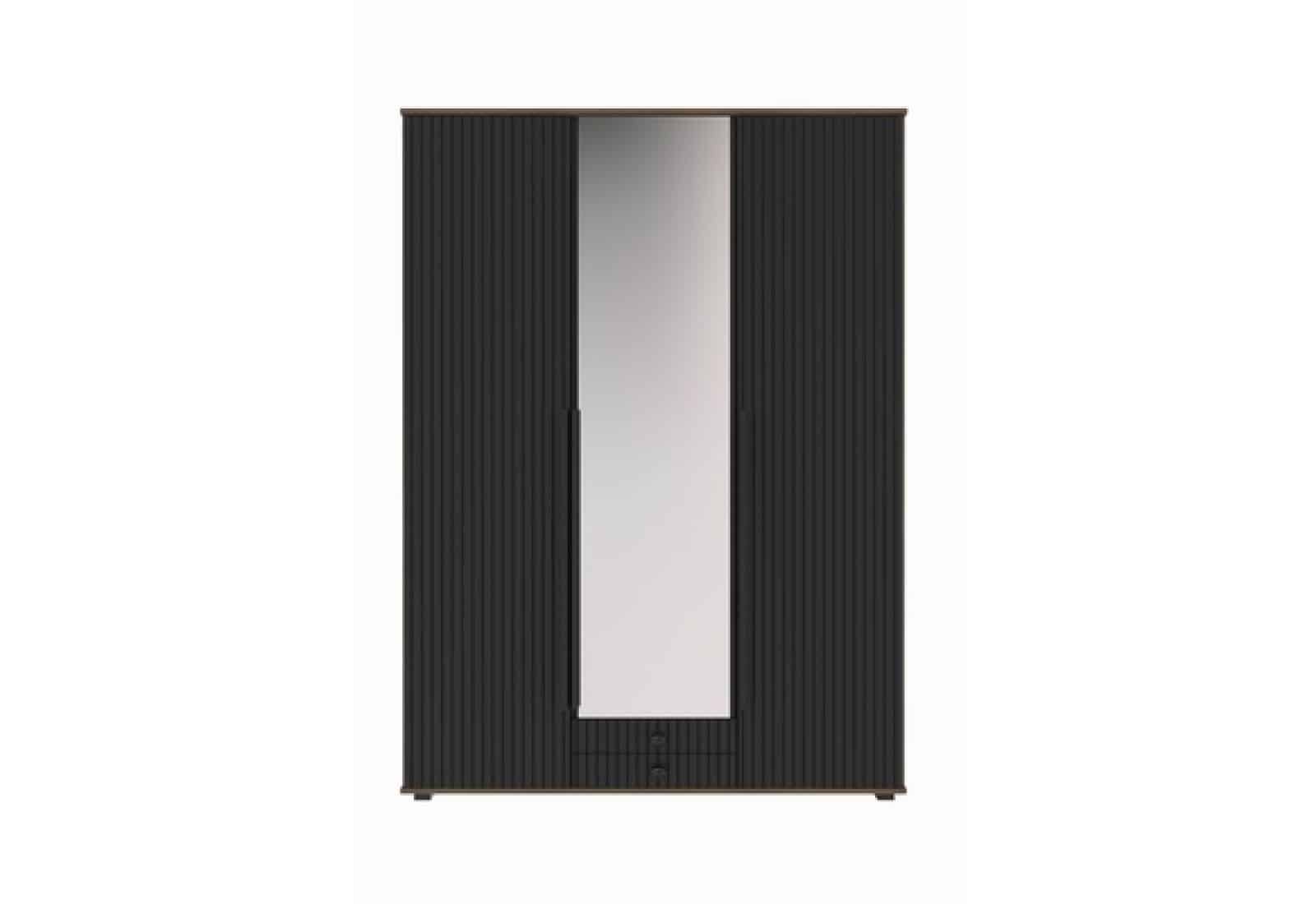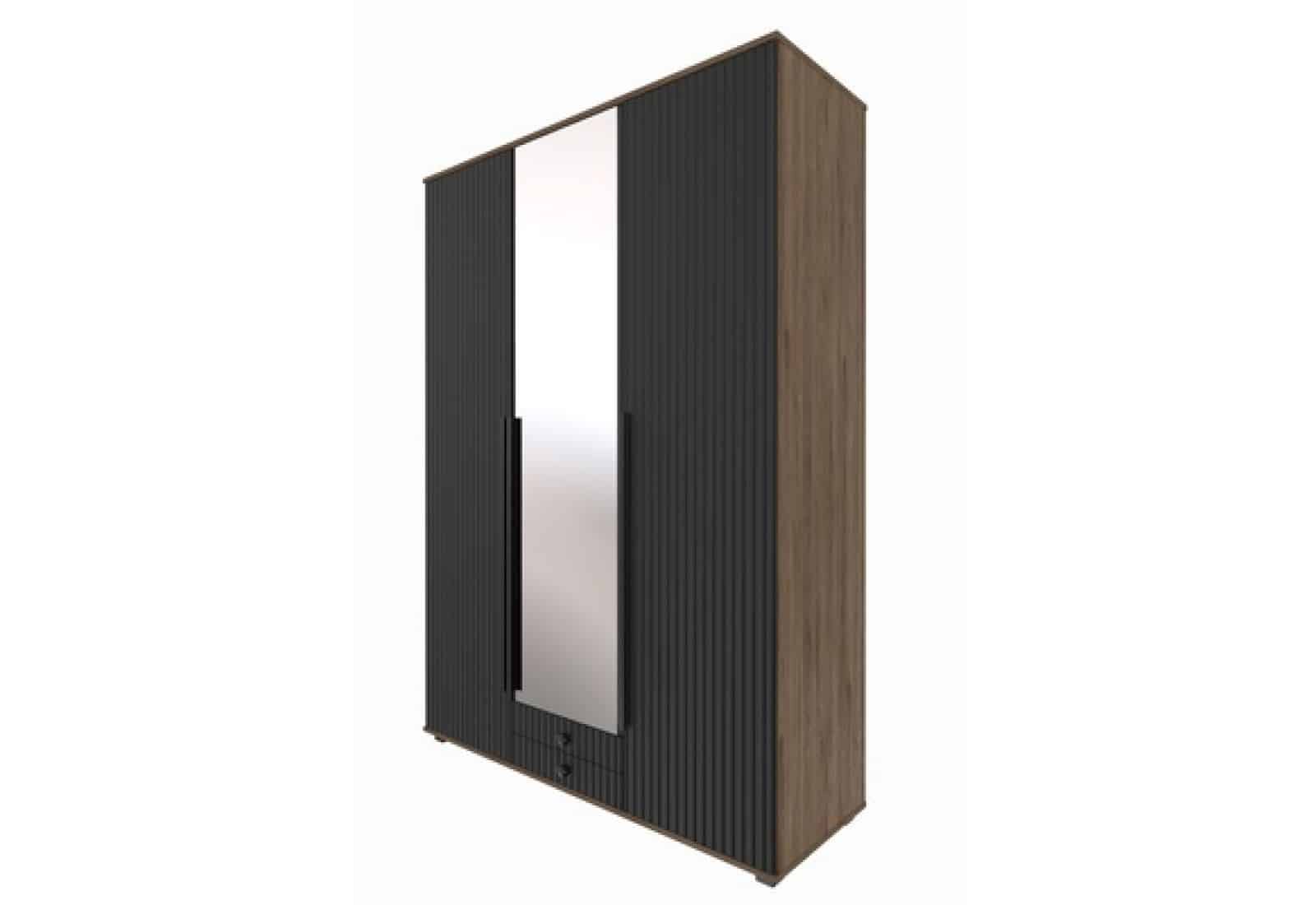Шкаф трехстворчатый распашной с ящиками и зеркалом, 1500*500*2000, слева штанга для одежды+полка сверху и полка снизу, справа 4 полки, посередине штанга и полка сверху, металлические опоры, ручка-профиль, ЛДСП Колор 16 мм, фасад МДФ 16 мм, фрезеровка вертикальными полосами, кромка 2+0,4 мм, скр.фурнитура, доводчик